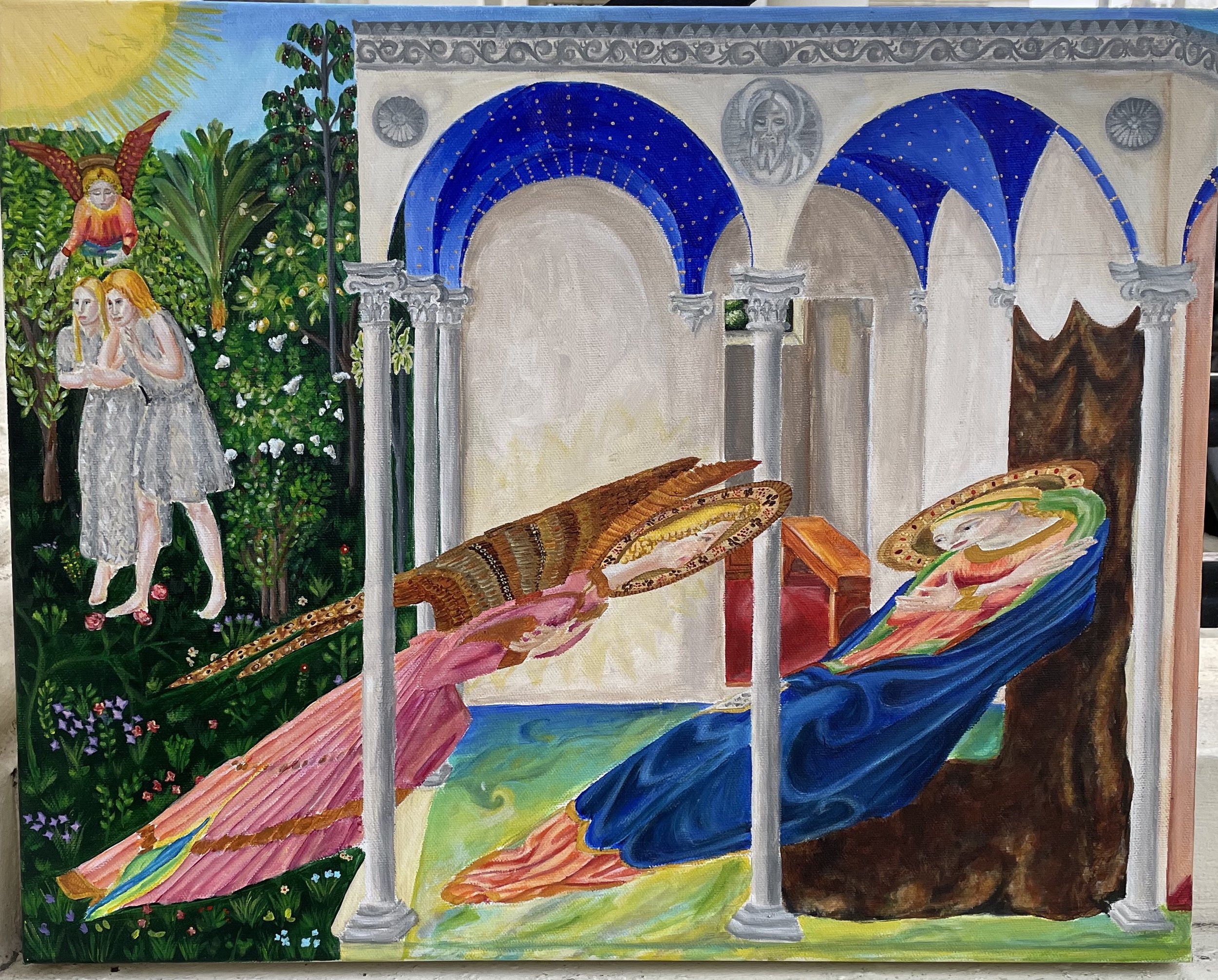 This is an adaptation of the classic Annunciation scene with Archangel Gabriel and the Virgin Mary. I kept reimagining a modern setting where he drops the big news on her and the Tennis court was the scene I chose to paint first.